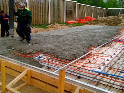 При строительстве в полу сразу же прокладываются силовые кабели, водопровод.