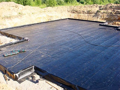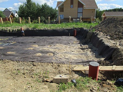 Сформируем правильную подушку под бетонное основание: проложим геотекстиль, насыплем щебень и песок, утрамбуем, сделаем гидроизоляцию и подбетонку.